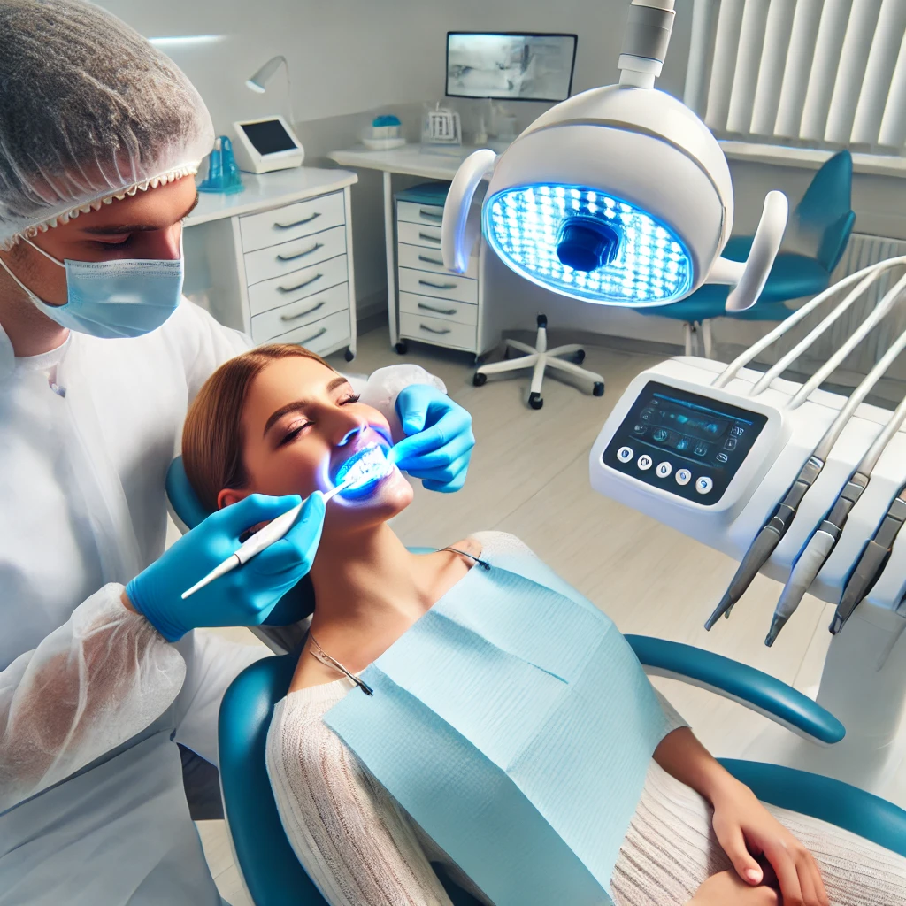 - Preparation: A protective barrier shields your gums, while the whitening gel is applied to the teeth.